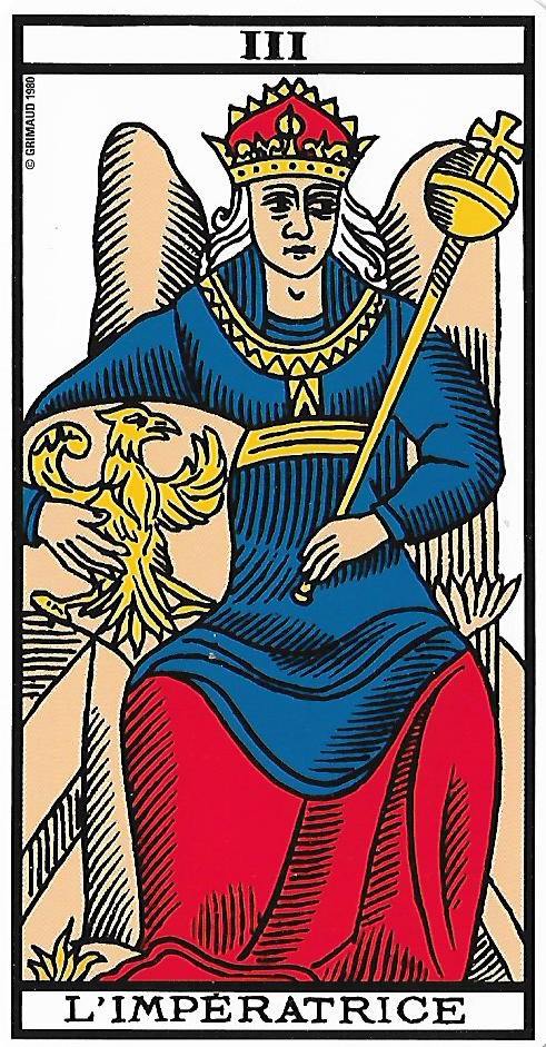 LA EMPERATRIZ, se muestra con firmeza, su maternidad la define como una mujer completa que puede procrear y gobernar al mismo tiempo. Ella tiene una dimensión amplia del conocimiento, está en este mundo abarcándolo en su totalidad, es la llave entre lo terreno y lo espiritual. Dirige el mundo terreno con una visión clara sobre lo que somos más allá de su entorno físico. Ella es el emprendimiento, la acción, no por la acción misma sino la acción con conocimiento. El actuar con un objetivo más alto, el hacer no para el beneficio personal sino para servir a la comunidad, la acción y el servicio unidos por la trascendencia.