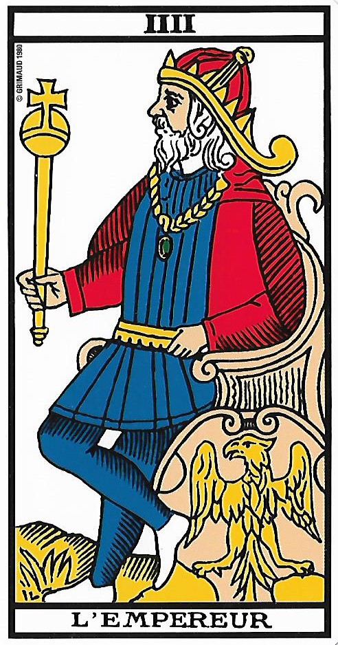 EL EMPERADOR, es el aspecto masculino del reinado sobre la tierra. Él reina sobre lo terreno y también sabe cuál es el hacer espiritual de la humanidad, qué trabajos tienen que hacer los seres humanos para librarse de sus dolores y sus culpas. Él lo ve todo sin sufrir por ello, sabe que ese dolor es necesario para crecer. Va a hacer todo lo posible para que las personas crezcan sin dolor, pero si esto no es posible él sabe por qué es así. Para las personas que gobierna actúa con una visión global de sus necesidades en la Tierra. Su mandato le ha sido dado para resolver que ellas convivan, coman y crezcan respetándose entre sí.
